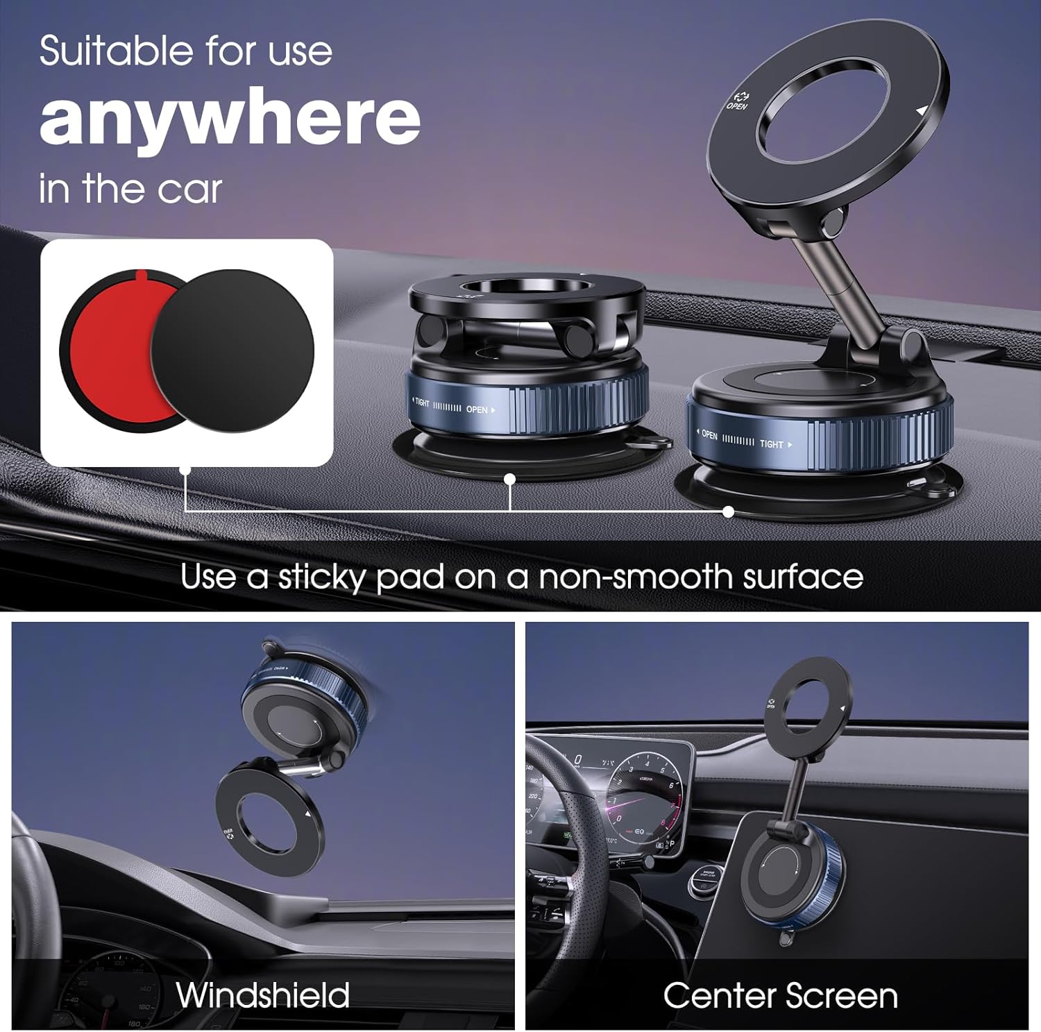 Charge-Free Convenience & Broad Compatibility: Compatible with a wide range of smartphones, including iPhone models from the 16 series to the 12 series, and devices with magnetic metal backs, our holder requires no charging. The upgraded vacuum technology ensures a firm hold, so you won’t have to worry about battery life affecting its performance