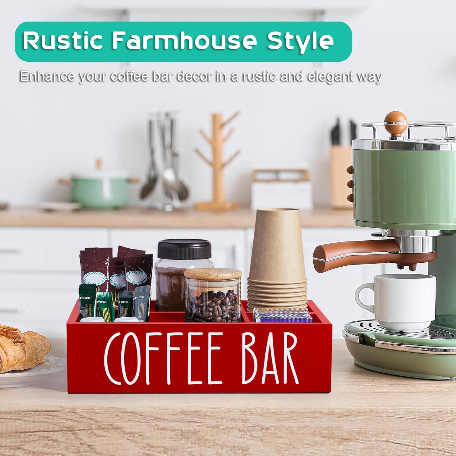 Coffee Bar Decor – The red wooden coffee organizer is an eye-catching display that brings rustic charm to your buffet, coffee or tea service, or self-serve beverage station. This red coffee bean rack will make your coffee bar look great!