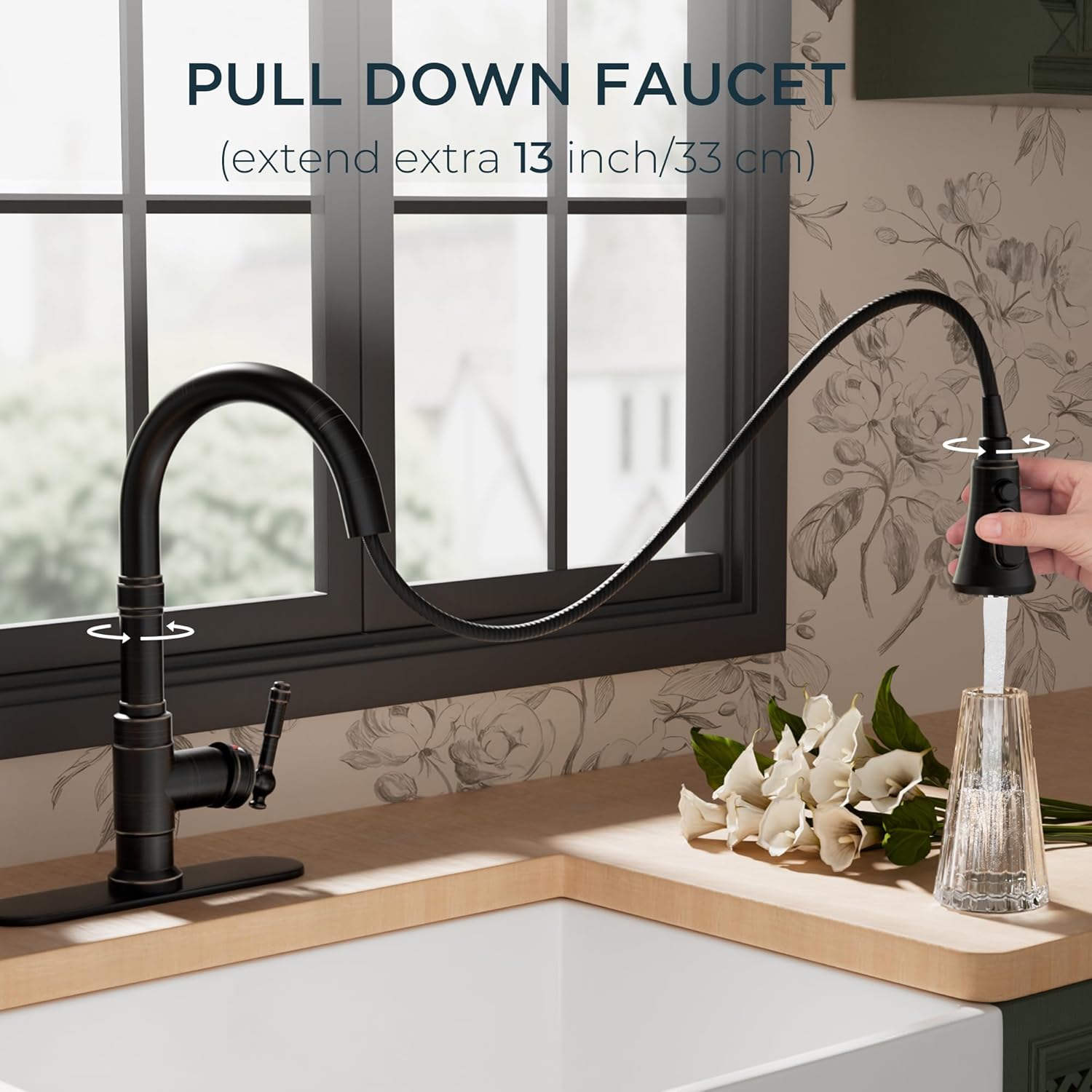 FORIOUS Vintage Kitchen Faucets with Pull Down Sprayer, Oil Rubbed Brown, High Arc Single Handle Stainless Steel Antique Pull Out Sink Faucet for Farmhouse Camper Rv Bar, Fit for 1 or 3 Hole