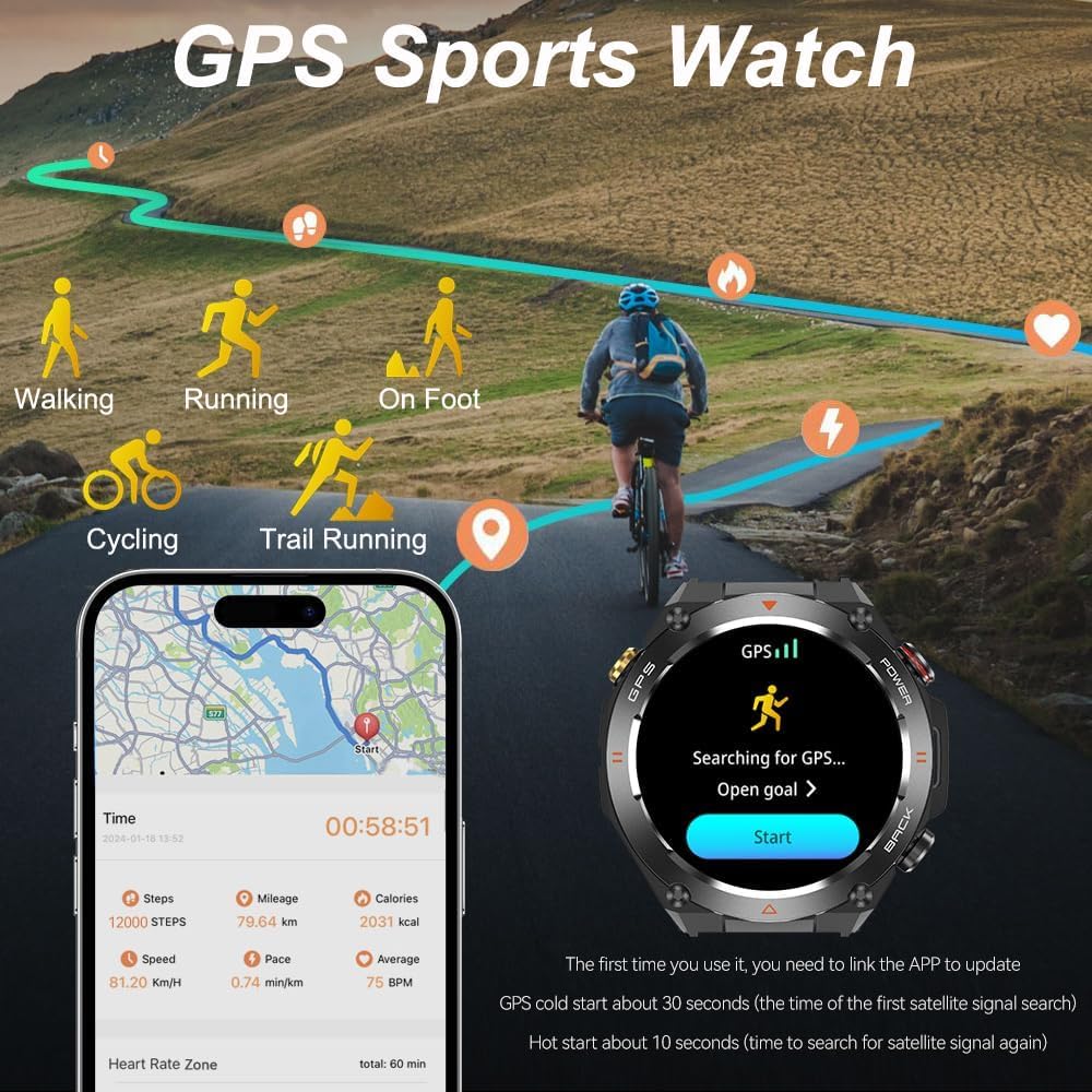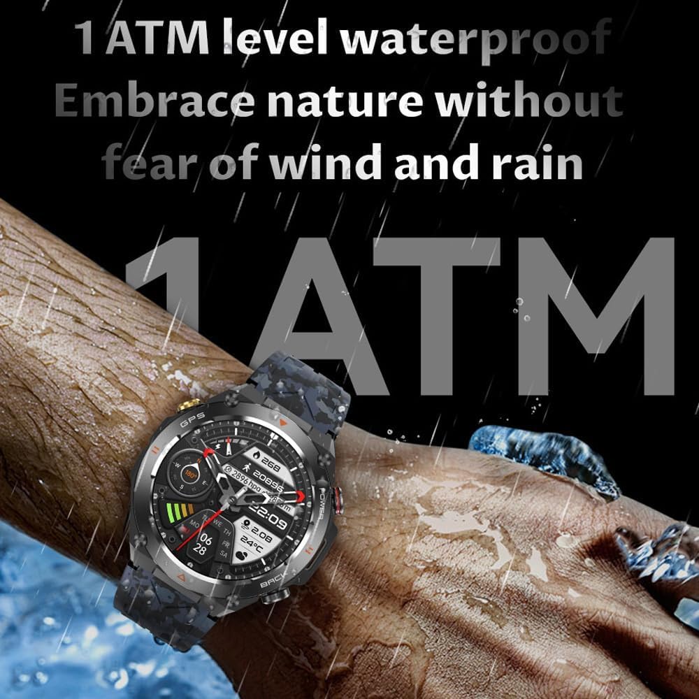 Long Battery Life & Multi-function: The military smart watch has an impressive 650mAh battery capacity, it offers a standby time of 90 days. For GPS outdoor use, the sports watch consistently delivers 10 days of battery life, guaranteeing reliable performance throughout the workweek. More useful features: weather, music control, camera control, stopwatch, alarm clock, stopwatch, find phone and so on.