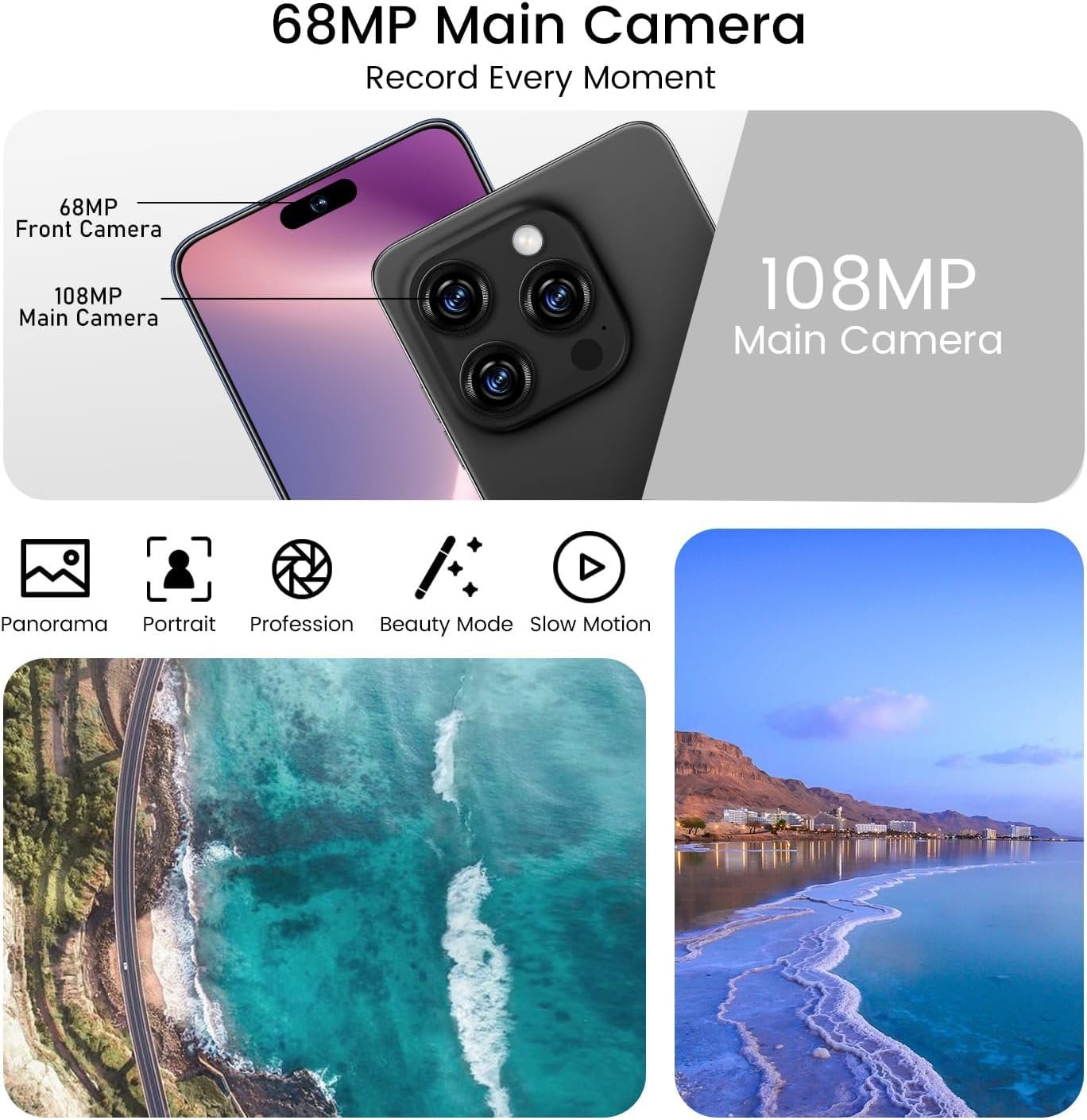 【6.99 HD+ Android 13.0】 This is an Android Cell phone with a large screen,6.99”HD+ Display 3040*1440,This unlocked Android 13.0 I16 ProMAX phone is equipped with a 68MP front facing camera and a 108MP main camera, better recording a beautiful life and showcasing your beauty. And it has facial recognition and Fingerprint button unlock and Quick button for taking photos,which effectively protect your privacy.