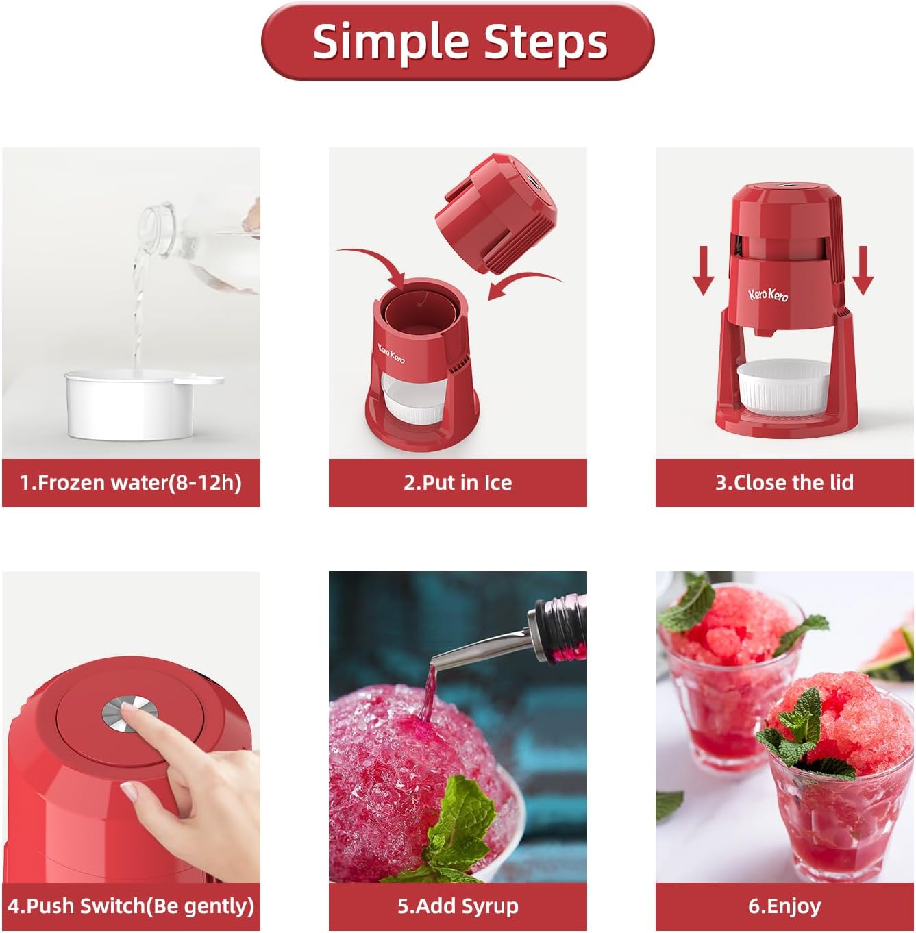 EASY TO USE: Portable Snow Cone Machine and Shaved Ice Maker with press switch design, easy to operate and use. Just add ice and gently press the switch to get your desired shaved ice, ice cream, etc.(Do not press hard to avoid slipping of the press chuck). Ice shaver machine is suitable for adults, kids to shaved ice at family gatherings to quickly prepare cool food.