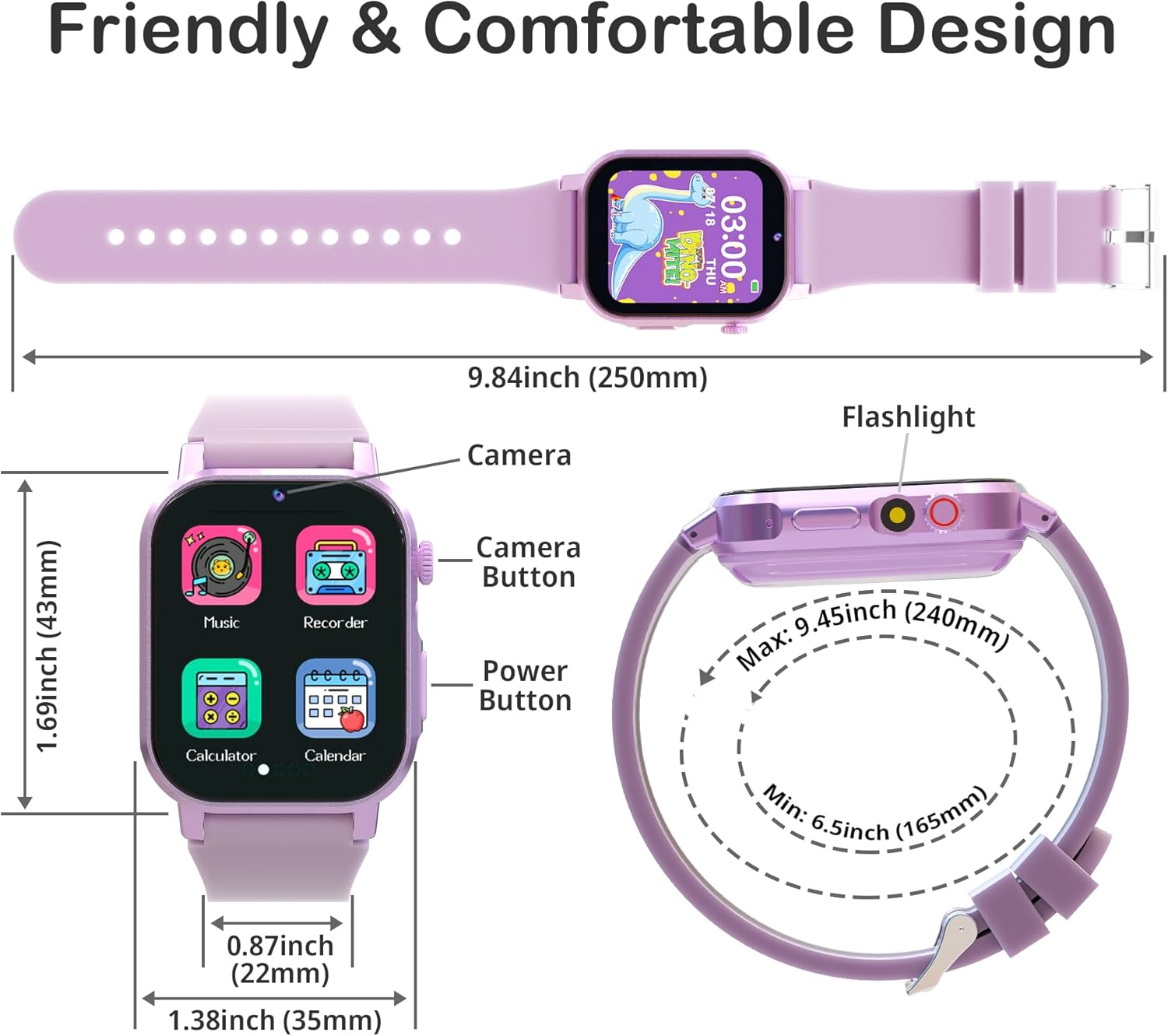 【Multifunctional Smart Watch for Kids】- Kids smart watch with 32 puzzle games, audio books, learn card, camera, music player, video, recording, habit tracking, alarm clock, calculator, calendar, flashlight, stopwatch, calculator, theme, screensaver select etc. The kids watch can bring convenience, fun, and an unprecedented new experience to children’s lives.