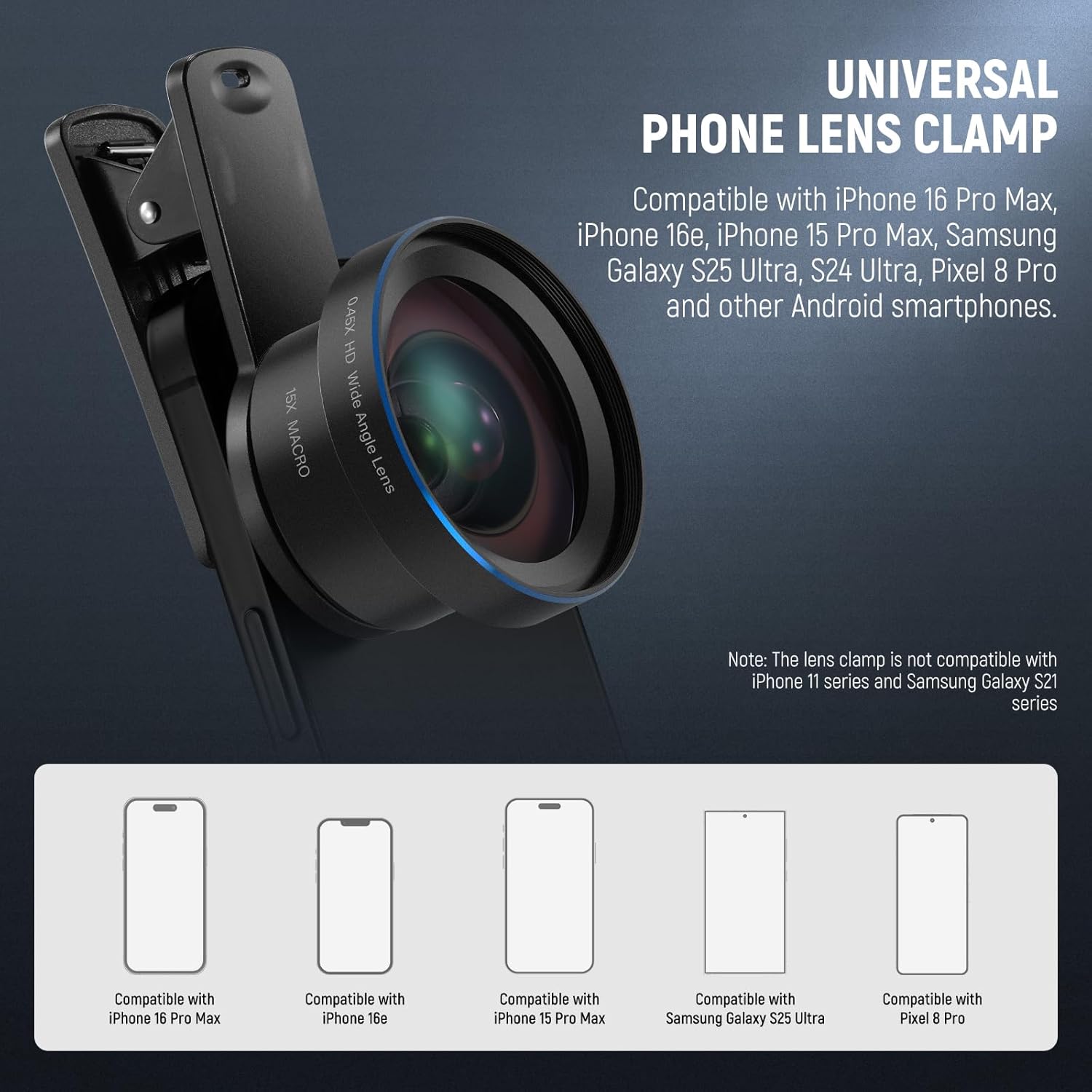 【Universal Phone Lens Clamp】 Compatible with iPhone 16 Pro Max 16e iPhone 15 Pro Max Samsung Galaxy S25 Ultra S24 Ultra Pixel 8 Pro and other Android smartphones. If your phone’s camera is protruding, we suggest using with a phone case. Ideal as content creator essential cell phone lens attachment and influencer must have quality photography and zoom effect filming accessories and gear. Note: The lens clamp is not compatible with iPhone 11 series and Samsung Galaxy S21 series