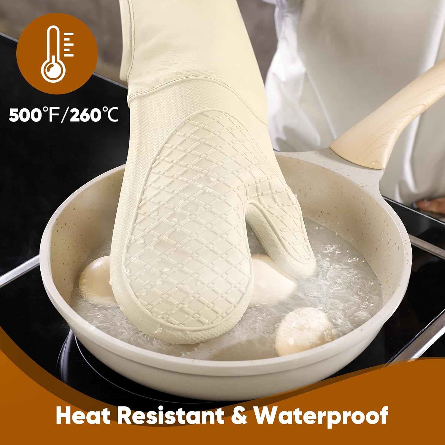 PREMIUM OVEN MITTS AND POT HOLDER SET:BPA free,waterproof and resisant, lining with soft cotton to adding extra protection while making the hand feel more comfortabled.Heat resistant up to 500 F: effectively protect your hands and forearms when you’re removing a pan or steamer from the oven or tending to the grill