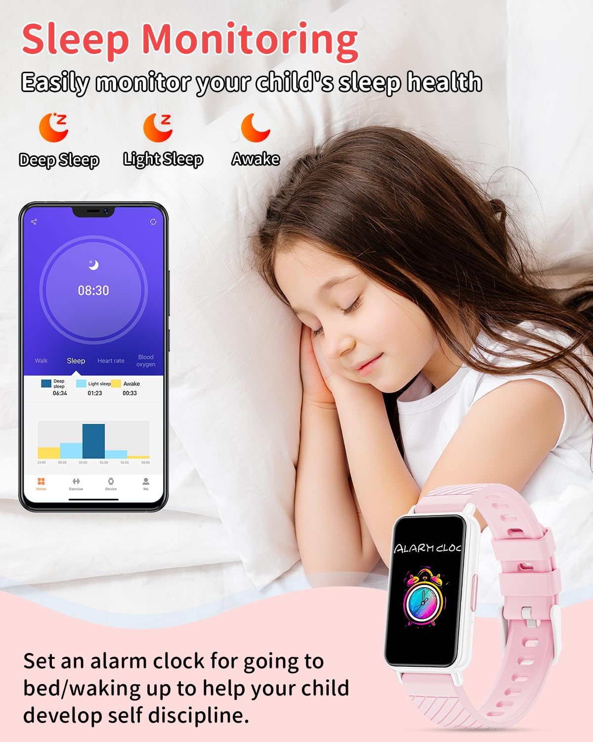 【High-precision sleep monitoring】: It can monitor real-time heart rate 24 hours a day and automatically track the child’s sleep status (deep sleep and light sleep). Multiple alarms can be set and the vibration intensity can be adjusted to help children develop regular sleep habits.