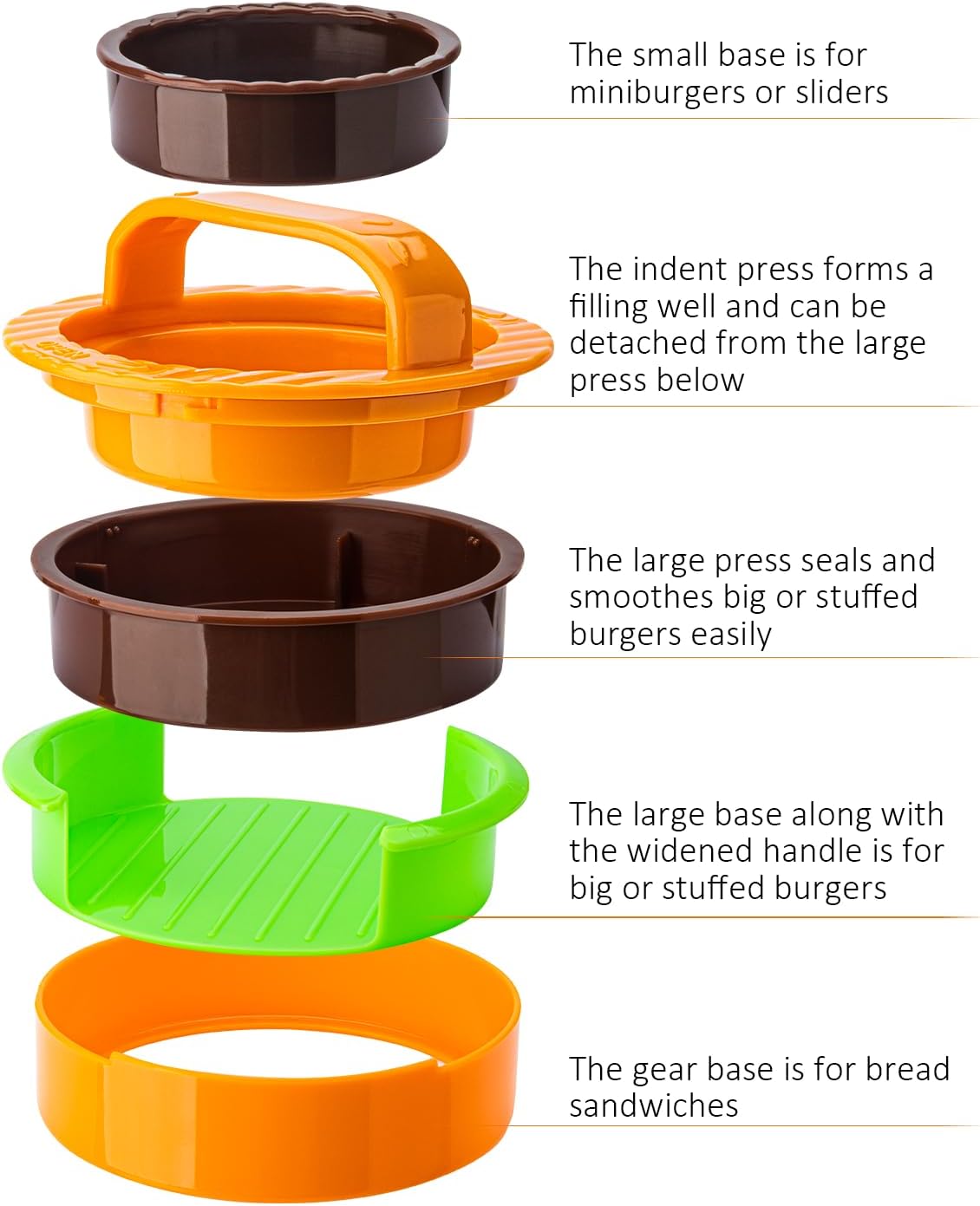 Ultimate 3-in-1 Hamburger Patty Maker: Create large, stuffed, and slider patties with ease! Features a small base for mini burgers, a detachable dimple mold for stuffed patties, and a large base for big burgers. Achieve restaurant-quality results every time.